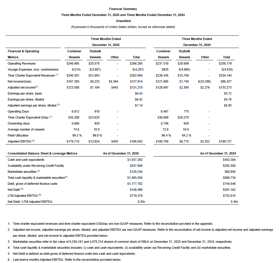 On a non-adjusted basis, our net income amounted to $117.9 million, or $6.42 earnings per diluted share, for the three months ended December 31, 2025 compared to net income of $90.4 million, or $4.70 earnings per diluted share, for the three months ended December 31, 2024. Our net income for the three months ended December 31, 2025 includes $3.9 million gain on marketable securities (gross of dividend income) compared to $35.6 million loss on marketable securities (gross of dividend income) in the three months ended December 31, 2024. On a non-adjusted basis, the net income of our container vessels segment amounted to $107.3 million for the three months ended December 31, 2025 compared to $122.0 million for the three months ended December 31, 2024. On a non-adjusted basis, the net income of our drybulk vessels segment amounted to $6.2 million of net income for the three months ended December 31, 2025 compared to $1.7 million of net income for the three months ended December 31, 2024.