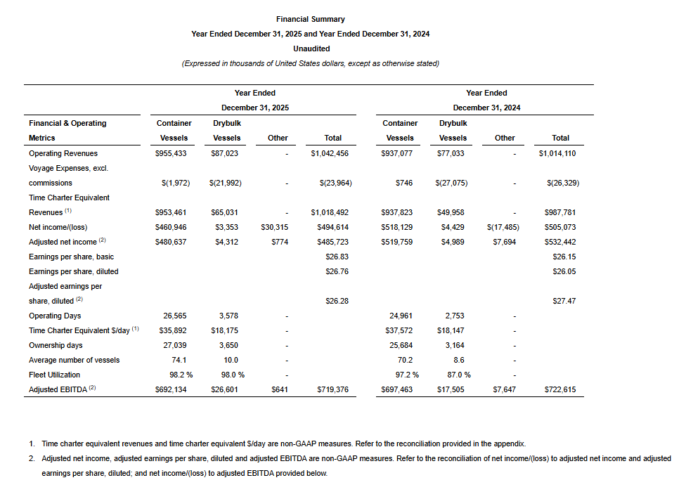 On a non-adjusted basis, our net income amounted to $494.6 million, or $26.76 earnings per diluted share, for the year ended December 31, 2025 compared to net income of $505.1 million, or $26.05 earnings per diluted share, for the year ended December 31, 2024. Our net income for the year ended December 31, 2025 includes $29.5 million gain on marketable securities (gross of dividend income) compared to $25.2 million loss on marketable securities (gross of dividend income) in the year ended December 31, 2024. On a non-adjusted basis, the net income of our container vessels segment amounted to $460.9 million for the year ended December 31, 2025 compared to $518.1 million for the year ended December 31, 2024. On a non-adjusted basis, the net income of our drybulk vessels segment amounted to $3.4 million for the year ended December 31, 2025 compared to $4.4 million net income for the year ended December 31, 2024.