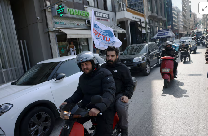 In Athens, dozens of protesters rallied earlier outside the ​shipowners’ union ⁠near the port of Piraeus and spray-painted: “No sacrifice for profits and wars” on the ground. A motorcycle convoy drove to the shipping ministry.